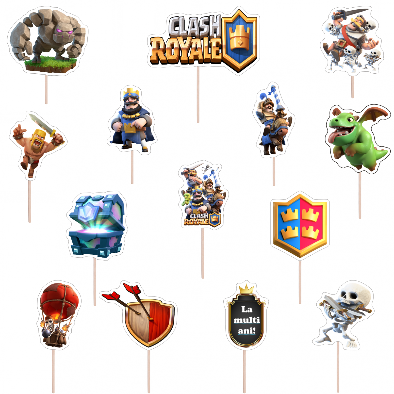 Creează un decor spectaculos pentru tortul de aniversare al copilului cu Setul de figurine Clash Royale! Acest set conține 13 toppere colorate și atrăgătoare, realizate din Hârtie Fotografică Glossy, cu grosimea de 240 gr/mp, albă și printată cu cerneală dye, necomestibilă. Fiecare topper este susținut de un suport din lemn, aducând un plus de stabilitate și estetică. Fiecare detaliu contează când vine vorba de petrecerile copiilor, iar acest set este alegerea perfectă pentru a aduce bucurie și entuziasm în rândul celor mici.